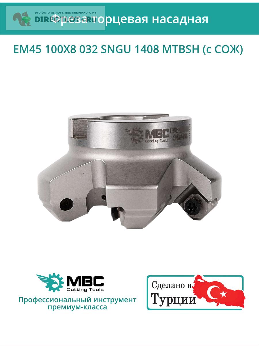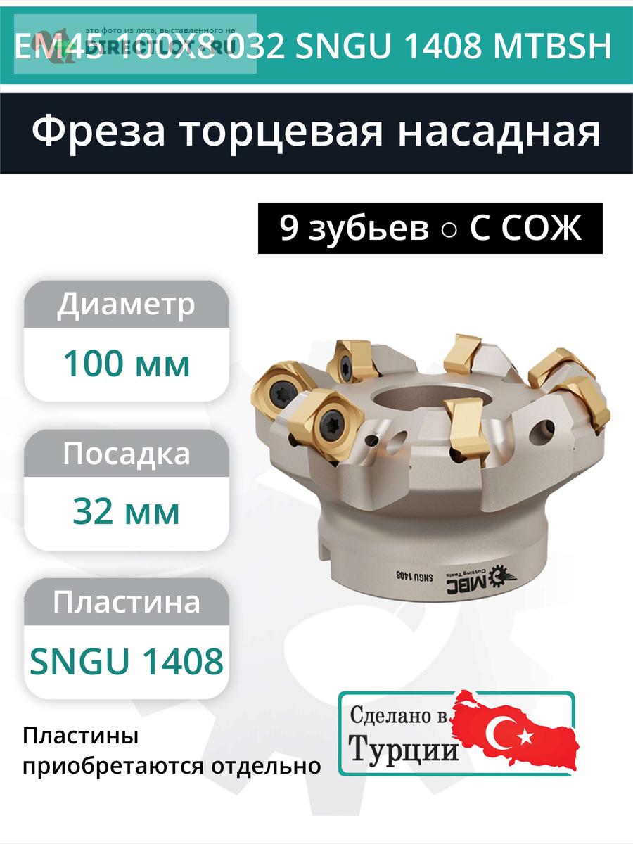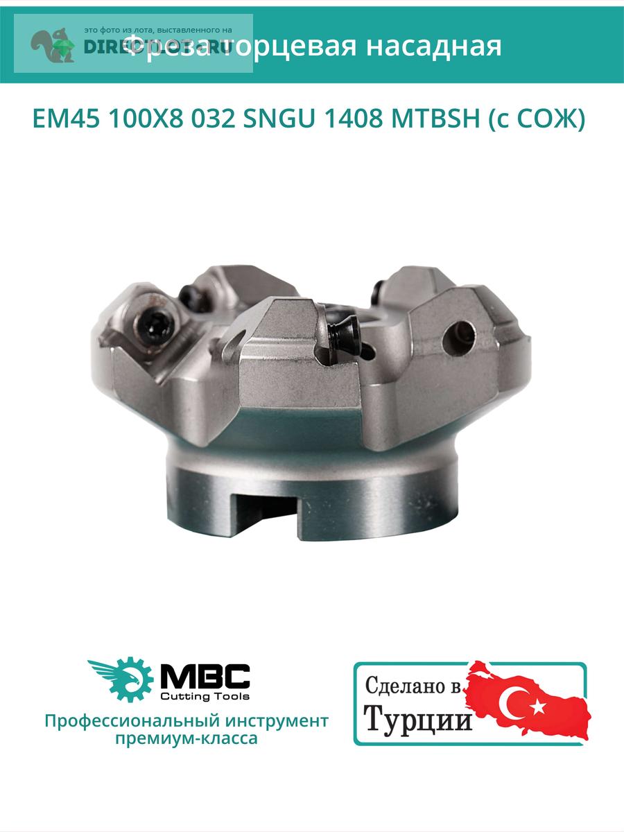 Профессиональная торцевая насадная фреза (совместима с MITSUBISHI), EM45 100X8 032 SNGU 1408 MTBSH с отверстием под СОЖ для фрезерного станка, используется с пластинами типа: SNGU 1408. Угол в плане 45°. Диаметр фрезы 100 мм, диаметр посадки 32 мм, количество зубьев 9 шт.