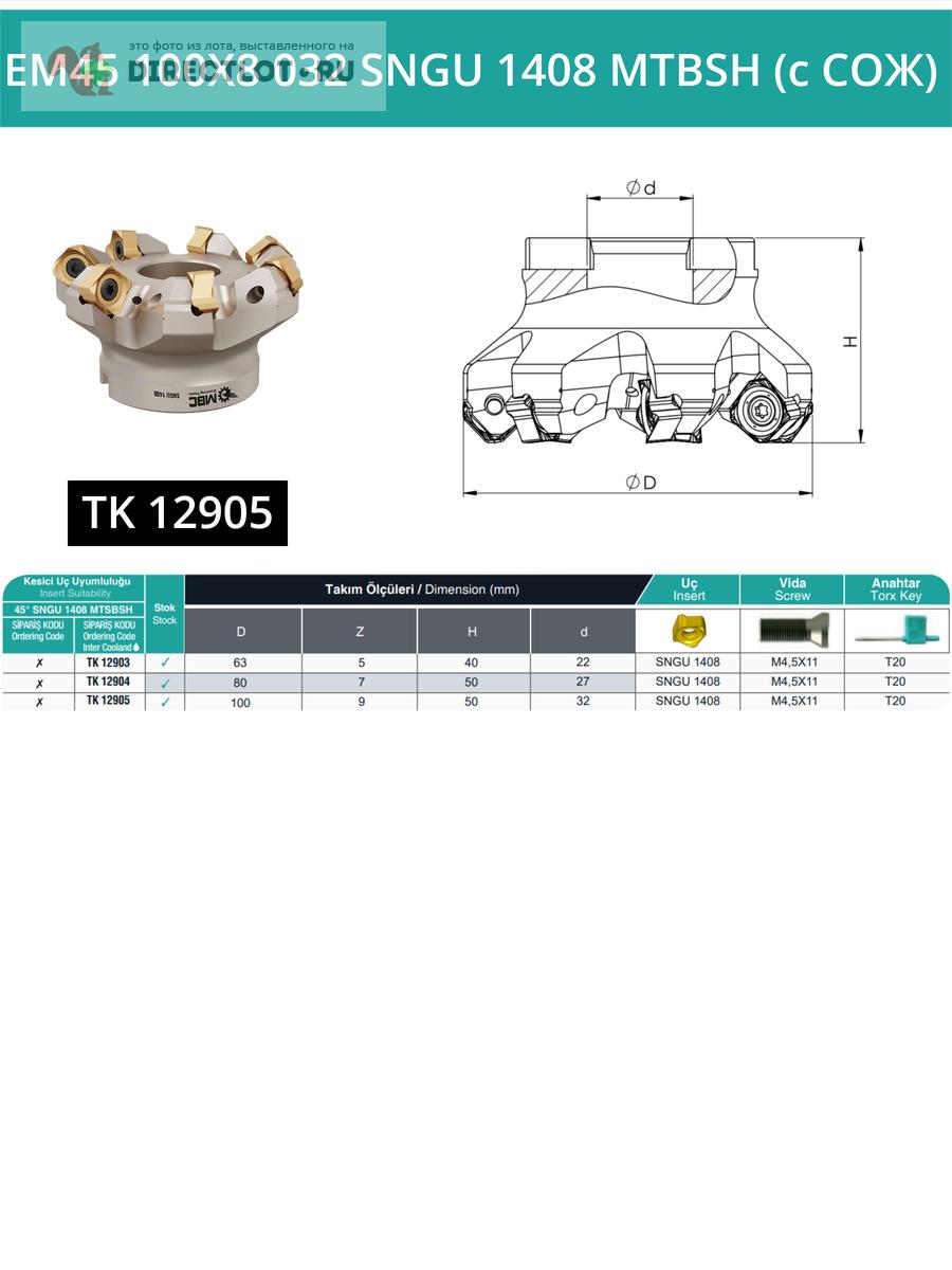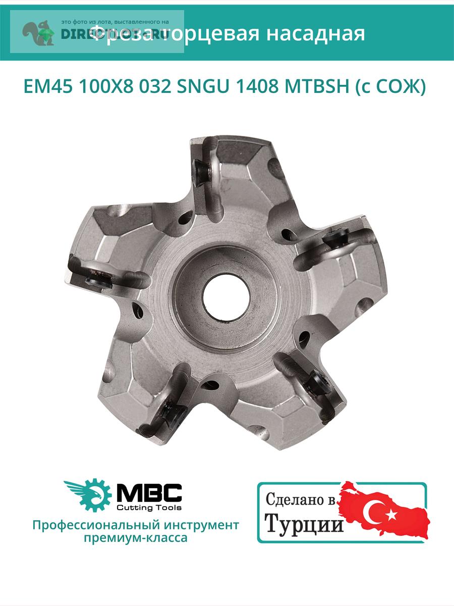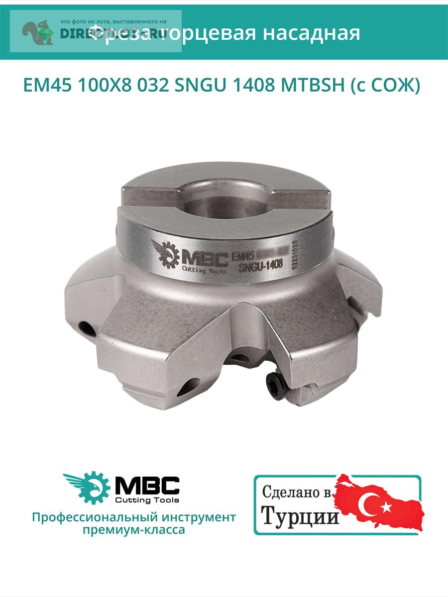 Профессиональная торцевая насадная фреза (совместима с MITSUBISHI), EM45 100X8 032 SNGU 1408 MTBSH с отверстием под СОЖ для фрезерного станка, используется с пластинами типа: SNGU 1408. Угол в плане 45°. Диаметр фрезы 100 мм, диаметр посадки 32 мм, количество зубьев 9 шт.