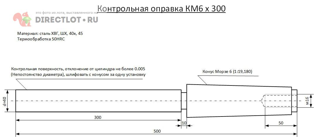 Добрый день. Требуется изготовить контрольную оправку (скалку) КМ6 c термичкой до HRC 50 и шлифовкой (материал: ХВГ, 40х, ст45 или на Ваш вкус из имеющегося у изготовителя), рабочая часть d40х300мм Если в ваш круглошлиф не лезет, то можно чуть короче, если лезет больше - лучше длиннее по-максимуму. Прилагаю эскиз, все размеры +/- лапоть (десятка, скажем), кроме конуса и цилиндричности. Диаметр желательно сделать как можно точнее, но тоже не критично.