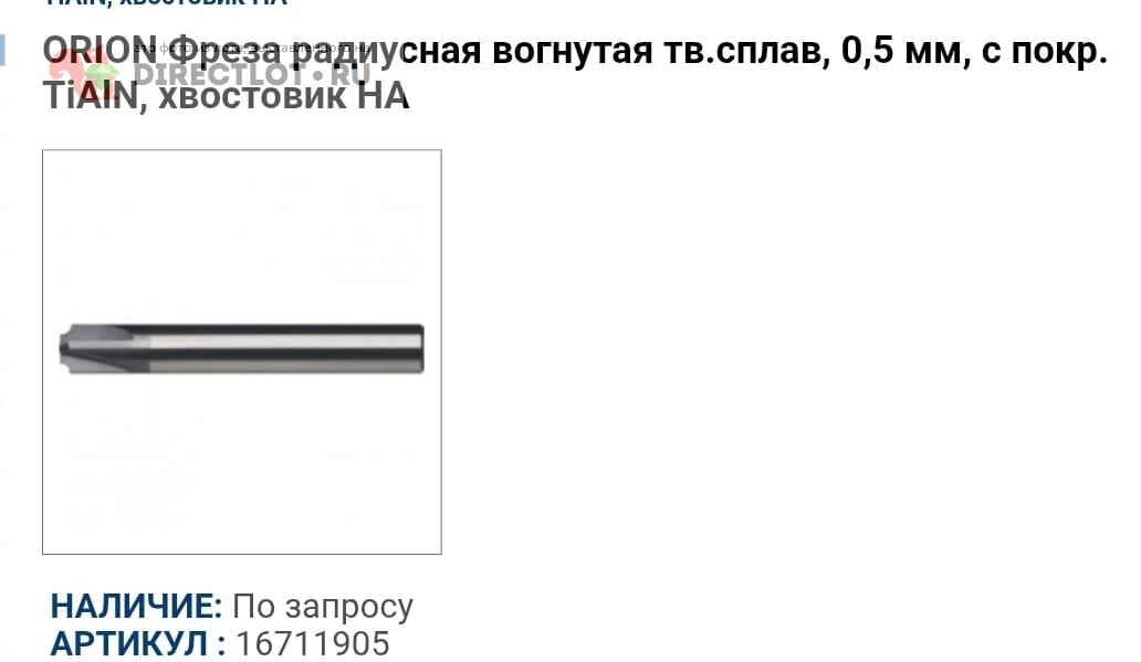 Код для вставки ссылки на эту страницу в сообщения на форумах: [url=https://directlot.ru/lot.php?id=1698121] Фреза радиусная вогнутая D8, R0.5. orion 16711905 купить, объявление на DIRECTLOT.RU [/url]