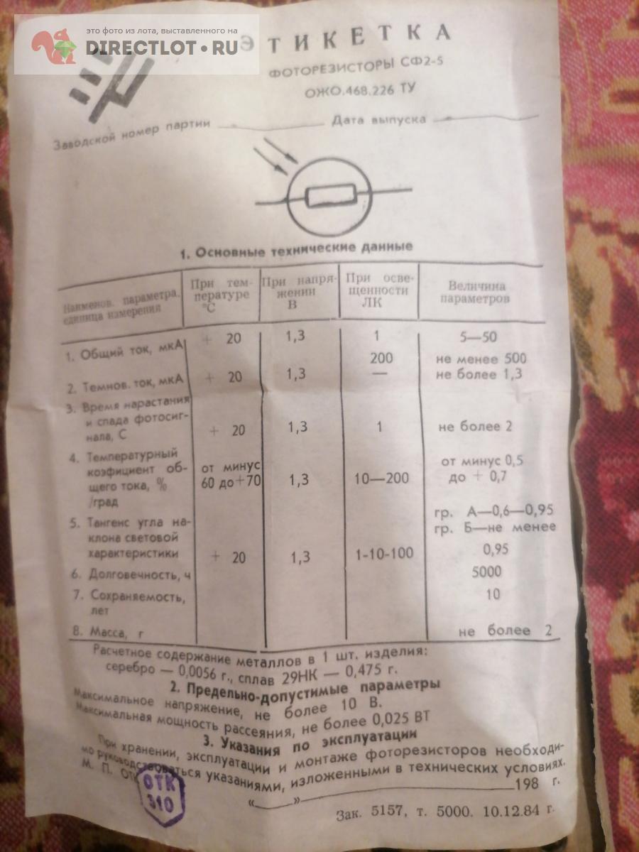 Код для вставки ссылки на эту страницу в сообщения на форумах: [url=https://directlot.ru/lot.php?id=1699369] Фоторезистор сф2-5А купить, объявление на DIRECTLOT.RU [/url]