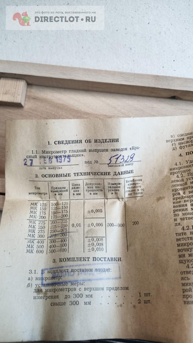 Код для вставки ссылки на эту страницу в сообщения на форумах: [url=https://directlot.ru/lot.php?id=1708149] Микрометр МК 250-275 "КРИН" №51329 ТВС 1975г. купить, объявление на DIRECTLOT.RU [/url]