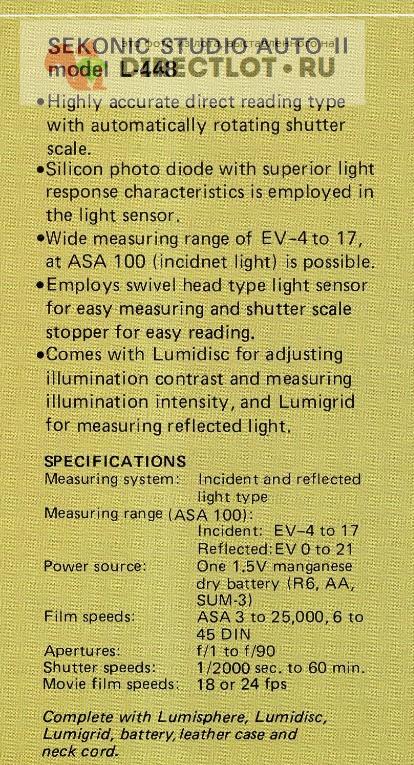 Редкая модель SEKONIC L-448 в отличном состоянии, может измерять как падающий свет с молочной полусферой, так и отраженный, если заменить полусферу на диск REF с круглым окном. При нажатии на кнопку замера встроенный мотор поворачивает диск калькулятора и с него считываются экспозиционные пары. Прибор удобно лежит в руке, измерительная головка поворотная, питание от одной пальчиковой батарейки АА. Футляр имеет вкладыш предотвращающий случайное нажатие на кнопку замера, предусмотрен отсек на молнии для хранения сменных дисков. Прибор полностью исправный, показания соизмеримы с современными навороченными экспонометрами за 500$. Отличный вариант в коллекцию или для работы.