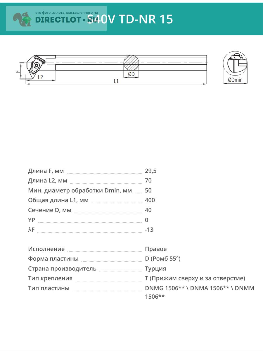 Профессиональная токарная державка (резец) S40V TD-NR 15 расточная внутренняя, правая. Державка предназначена для работы с пластинами следующего типа: DNMG 1506** \ DNMA 1506** \ DNMM 1506**. Используется для выполнения операций по обработке внутренних поверхностей деталей, таких как растачивание отверстий, снятие фасок и подрезка торцов и т.п. Подходит для точной и эффективной обработки материалов на станках с ЧПУ и универсальных токарных станках. Державка имеет сечение 40 мм и длину 400 мм.