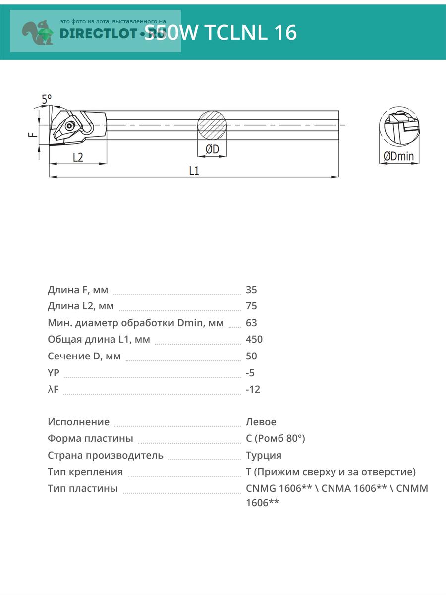 Профессиональная токарная державка (резец) S50W TCLNL 16 расточная внутренняя, левая. Державка предназначена для работы с пластинами следующего типа: CNMG 1606** \ CNMA 1606** \ CNMM 1606**. Используется для выполнения операций по обработке внутренних поверхностей деталей, таких как растачивание отверстий, снятие фасок и подрезка торцов и т.п. Подходит для точной и эффективной обработки материалов на станках с ЧПУ и универсальных токарных станках. Державка имеет сечение 50 мм и длину 450 мм.