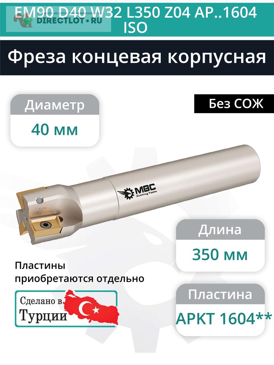 Профессиональная корпусная концевая фреза EM90 D40 W32 L350 Z04 AP..1604 ISO без подвода СОЖ для фрезерного станка, используется с пластинами следующего типа: APKT 1604**. Общая длина фрезы 350 мм, диаметр 40 мм, 4 зуба.