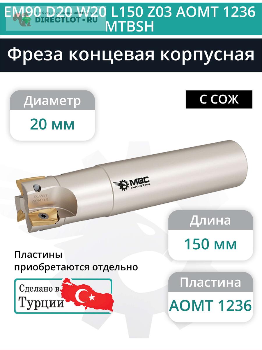 Профессиональная корпусная концевая фреза EM90 D20 W20 L150 Z03 AOMT 1236 MTBSH с подводом СОЖ для фрезерного станка, используется с пластинами следующего типа: AOMT 1236. Общая длина фрезы 150 мм, диаметр 20 мм, 3 зуба.