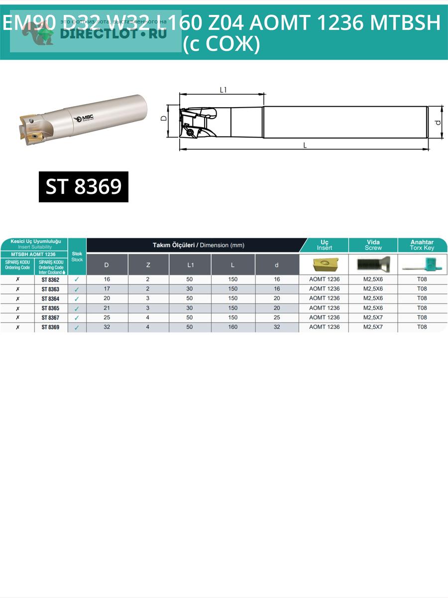 Профессиональная корпусная концевая фреза EM90 D32 W32 L160 Z04 AOMT 1236 MTBSH с подводом СОЖ для фрезерного станка, используется с пластинами следующего типа: AOMT 1236. Общая длина фрезы 160 мм, диаметр 32 мм, 4 зуба.