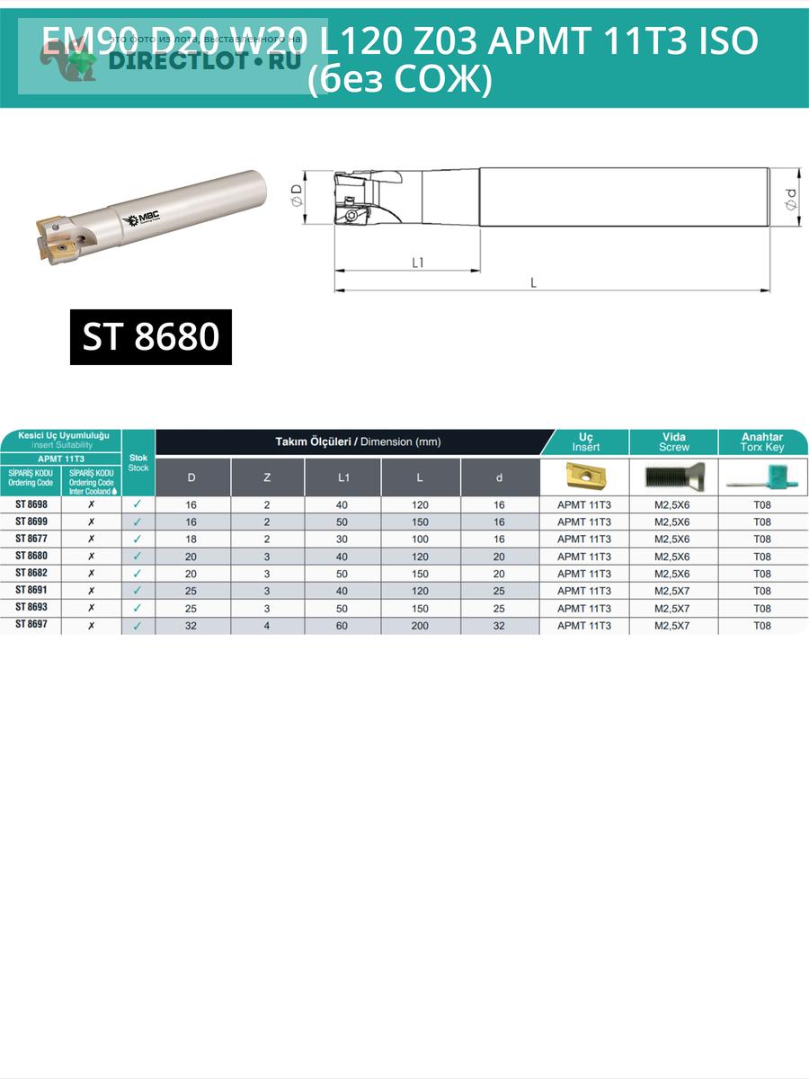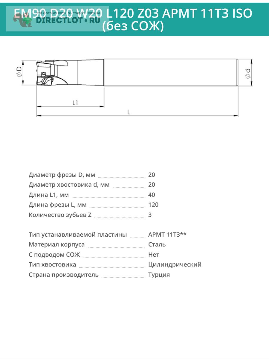 Профессиональная корпусная концевая фреза EM90 D20 W20 L120 Z03 APMT 11T3 ISO без подвода СОЖ для фрезерного станка, используется с пластинами следующего типа: APMT 11T3**. Общая длина фрезы 120 мм, диаметр 20 мм, 3 зуба.