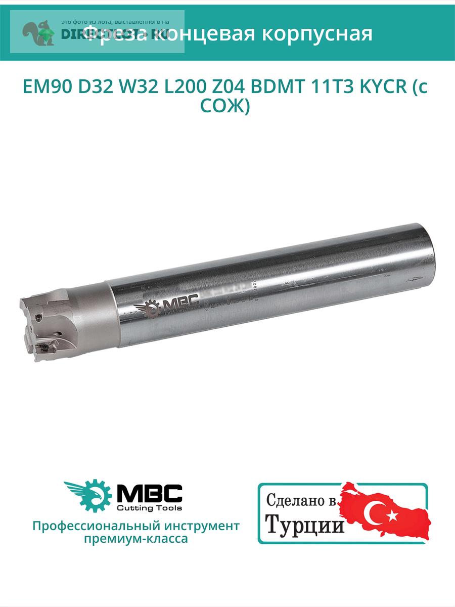 Профессиональная корпусная концевая фреза EM90 D32 W32 L200 Z04 BDMT 11T3 KYCR с подводом СОЖ для фрезерного станка, используется с пластинами следующего типа: BDMT 11T3. Общая длина фрезы 200 мм, диаметр 32 мм, 4 зуба.