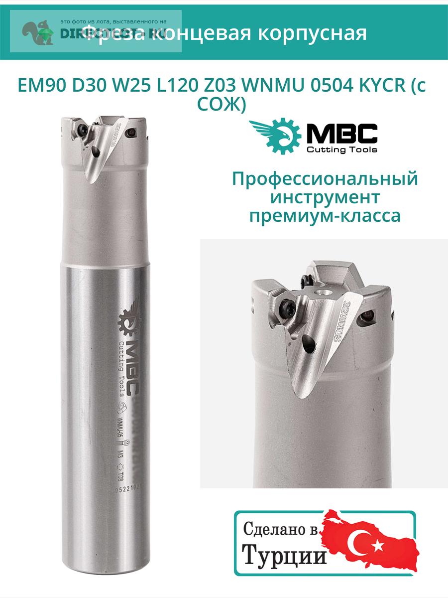 Профессиональная корпусная концевая фреза EM90 D30 W25 L120 Z03 WNMU 0504 KYCR с подводом СОЖ для фрезерного станка, используется с пластинами следующего типа: WNMU 0504**. Общая длина фрезы 120 мм, диаметр 30 мм, 3 зуба.