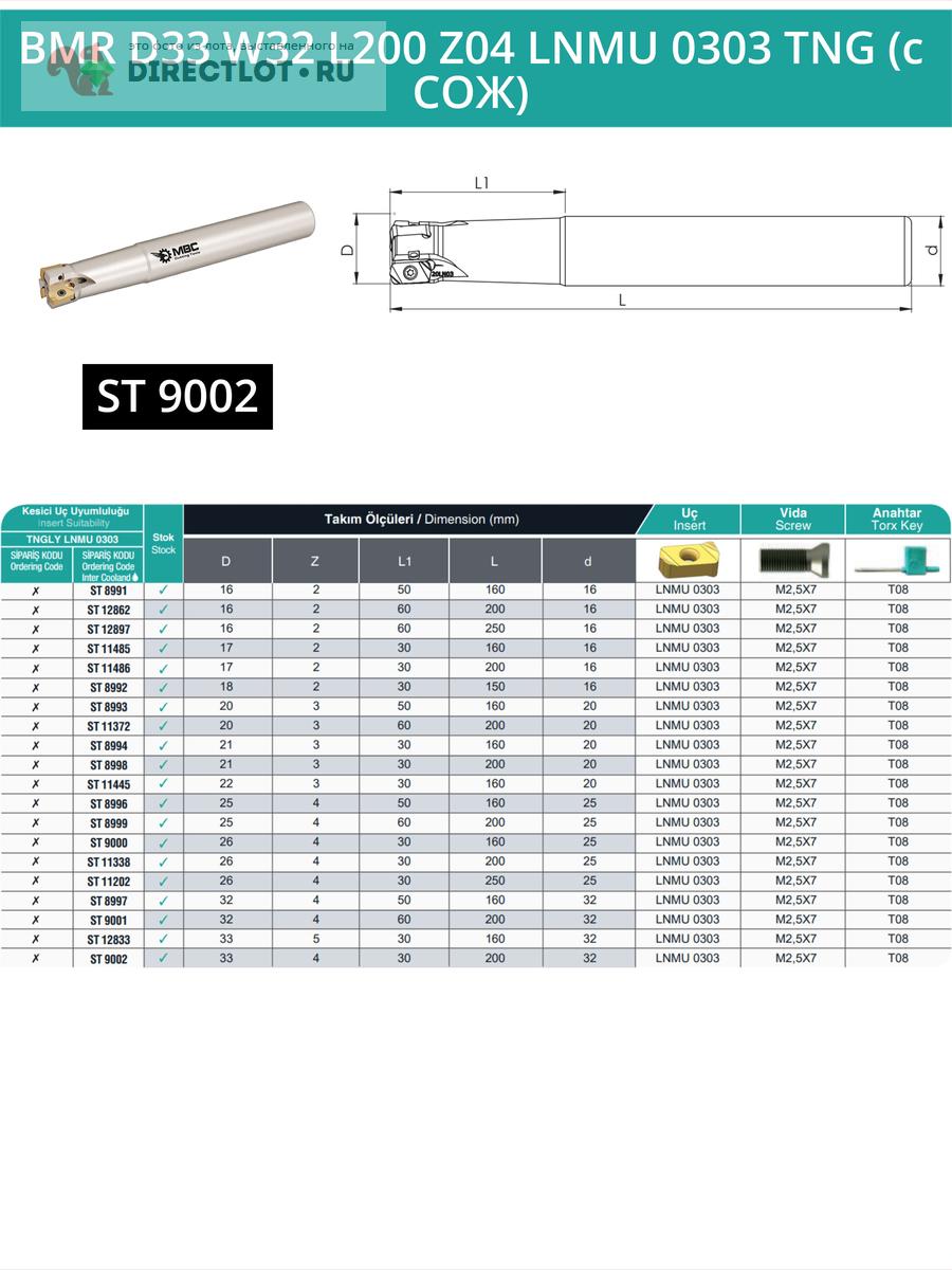 Код для вставки ссылки на эту страницу в сообщения на форумах: [url=https://directlot.ru/lot.php?id=1734729] Концевая фреза корпусная 33 мм, 4 зуба, L 200 мм / BMR D33 W32 L200 Z04 LNMU 0303 TNG (с СОЖ) купить, объявление на DIRECTLOT.RU [/url]