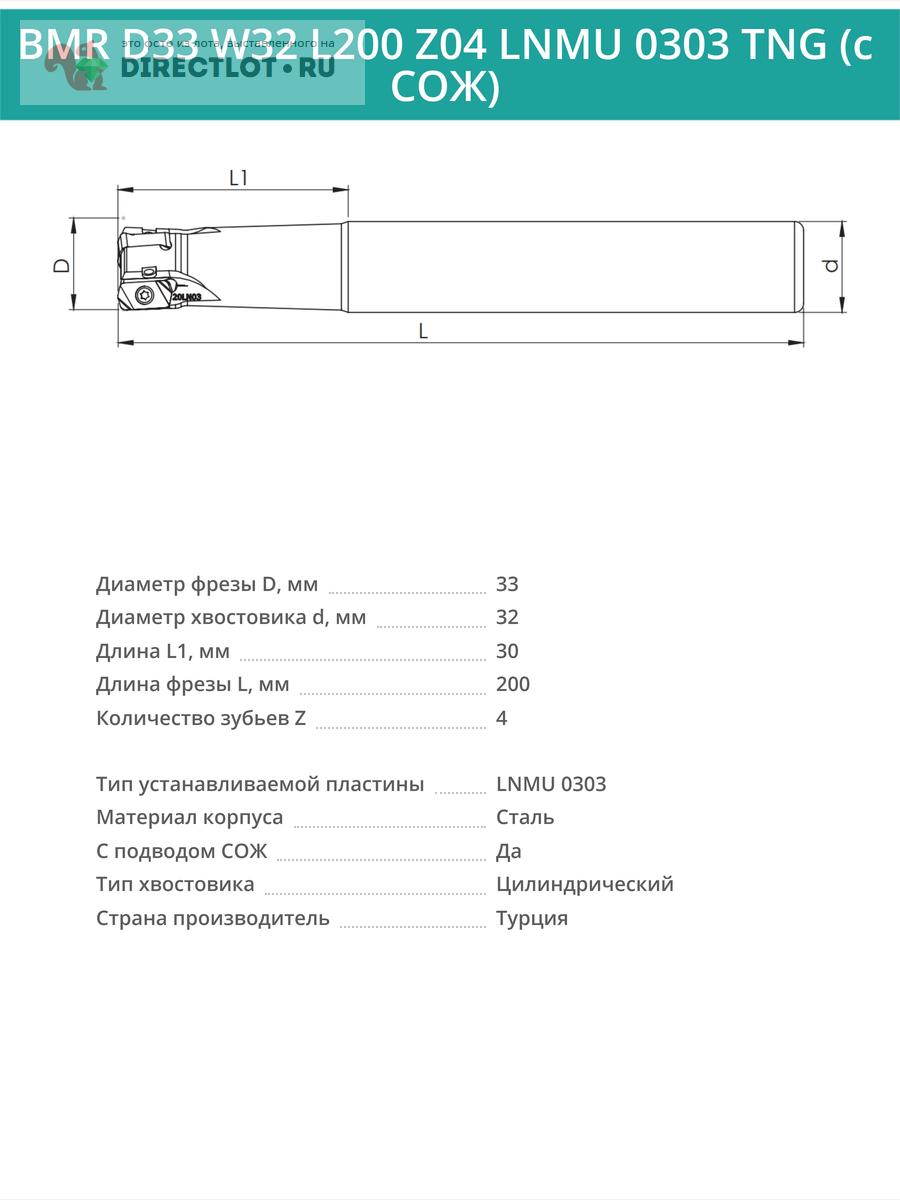 Профессиональная корпусная концевая фреза BMR D33 W32 L200 Z04 LNMU 0303 TNG с подводом СОЖ для фрезерного станка, используется с пластинами следующего типа: LNMU 0303. Общая длина фрезы 200 мм, диаметр 33 мм, 4 зуба.