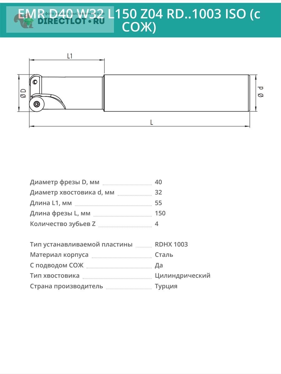 Профессиональная корпусная концевая фреза EMR D40 W32 L150 Z04 RD..1003 ISO с подводом СОЖ для фрезерного станка, используется с пластинами следующего типа: RDHX 1003. Общая длина фрезы 150 мм, диаметр 40 мм, 4 зуба.