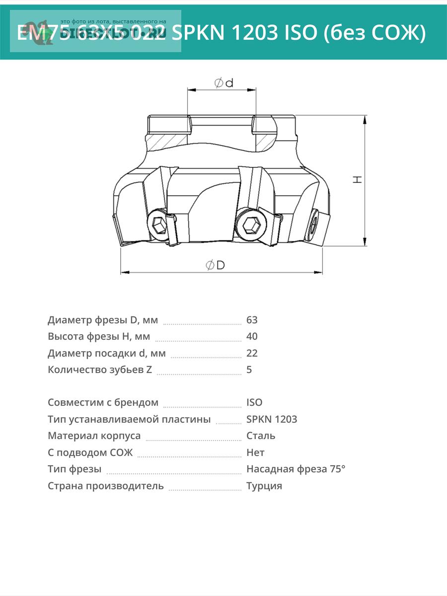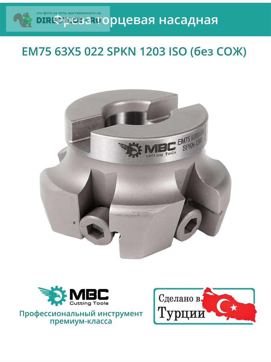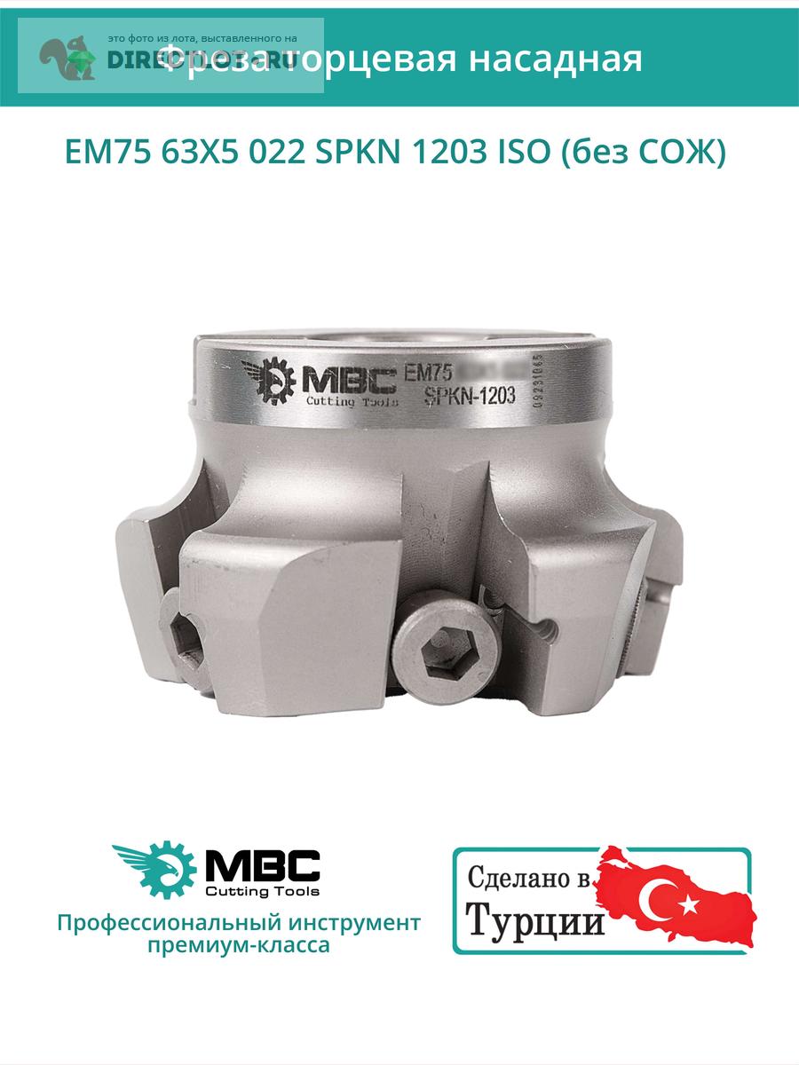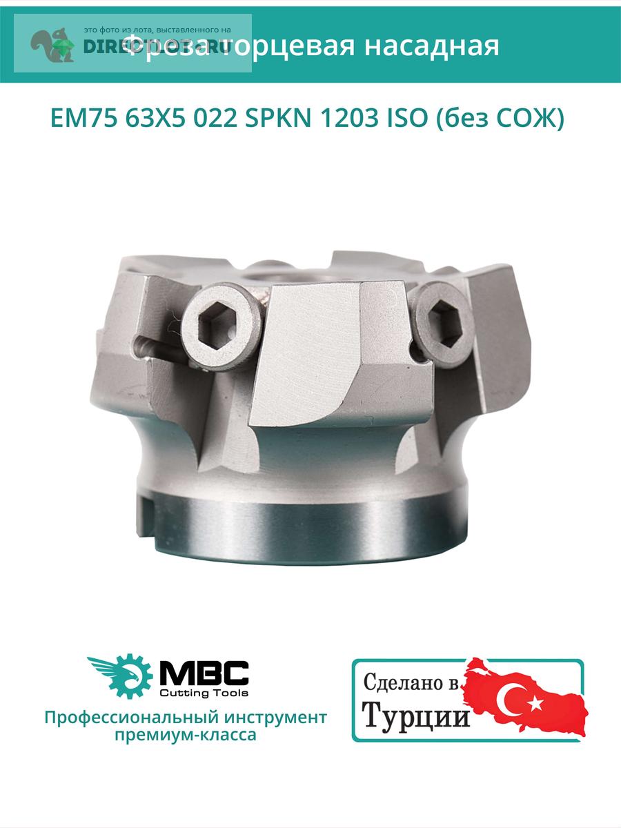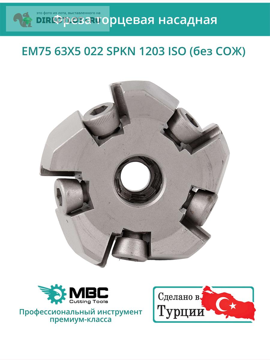 Профессиональная торцевая насадная фреза (совместима с ISO), EM75 63X5 022 SPKN 1203 ISO без отверстия под СОЖ для фрезерного станка, используется с пластинами типа: SPKN 1203. Угол в плане 75°. Диаметр фрезы 63 мм, диаметр посадки 22 мм, количество зубьев 5 шт.