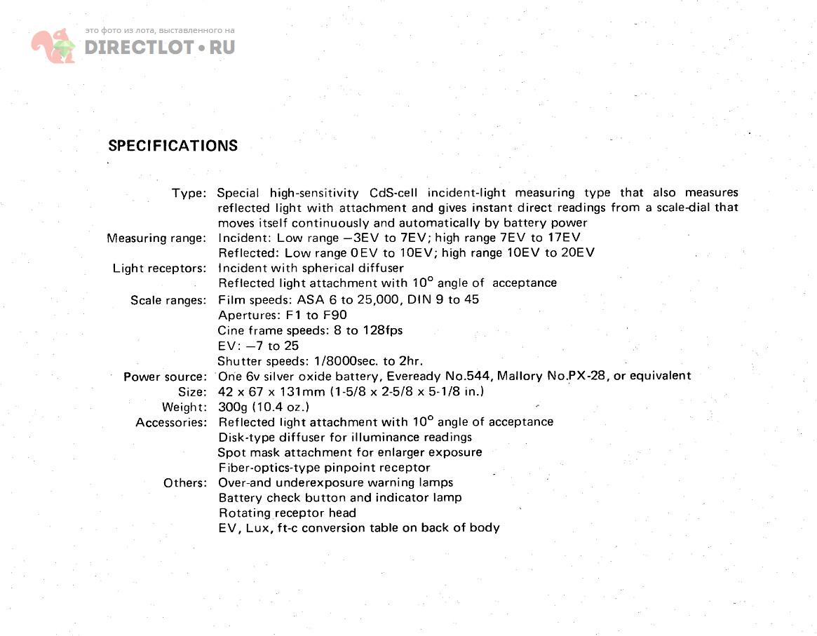 Старинный навороченный профессиональный фотоэкспонометр с возможностью присоединения дополнительных насадок для различных видов измерений. Состояние косметическое очень хорошее, но, к сожалению, на свет не реагирует, хотя питание входит, продается как неисправный в коллекцию или под восстановление. Внутри винты под контровкой т.е. его не пытались ремонтировать, отсутствует один крепежный винт корпуса, в батарейном отсеке следов окислов нет.