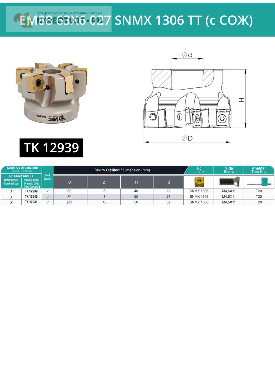 Фреза торцевая насадная 63 мм, посадка 22 мм, 6 зубьев EM88 63X6 027 SNMX 1306 TT (с СОЖ) купить