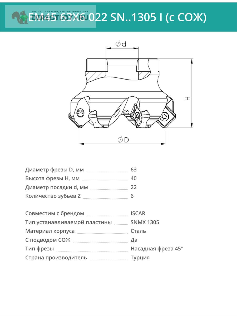 Профессиональная торцевая насадная фреза (совместима с ISCAR), EM45 63X6 022 SN..1305 I с отверстием под СОЖ для фрезерного станка, используется с пластинами типа: SNMX 1305. Угол в плане 45°. Диаметр фрезы 63 мм, диаметр посадки 22 мм, количество зубьев 6 шт.