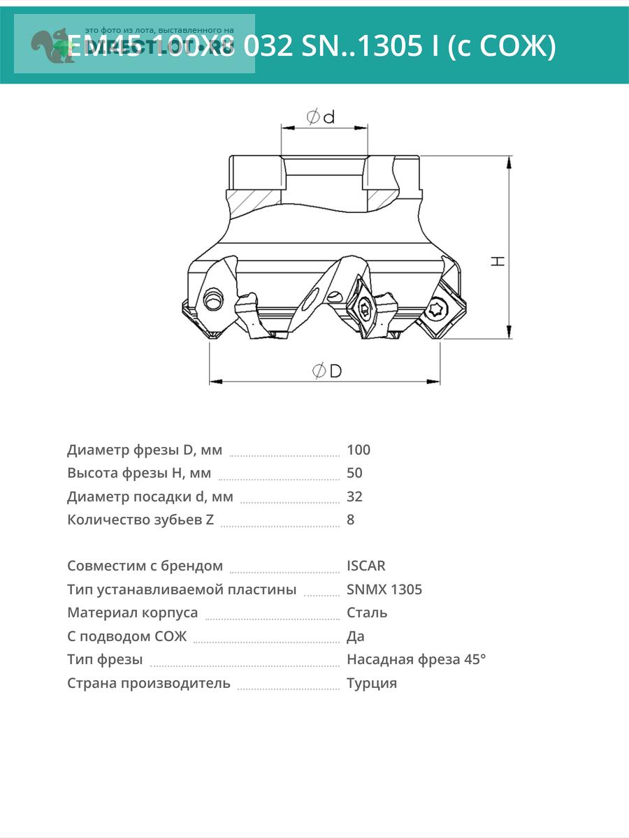 Профессиональная торцевая насадная фреза (совместима с ISCAR), EM45 100X8 032 SN..1305 I с отверстием под СОЖ для фрезерного станка, используется с пластинами типа: SNMX 1305. Угол в плане 45°. Диаметр фрезы 100 мм, диаметр посадки 32 мм, количество зубьев 8 шт.