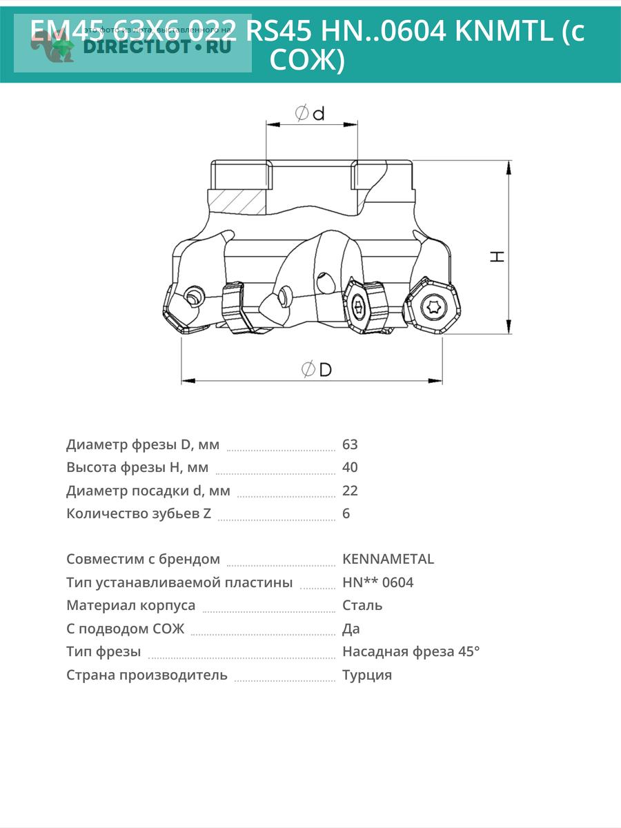 Профессиональная торцевая насадная фреза (совместима с KENNAMETAL), EM45 63X6 022 RS45 HN..0604 KNMTL с отверстием под СОЖ для фрезерного станка, используется с пластинами типа: HN** 0604. Угол в плане 45°. Диаметр фрезы 63 мм, диаметр посадки 22 мм, количество зубьев 6 шт.