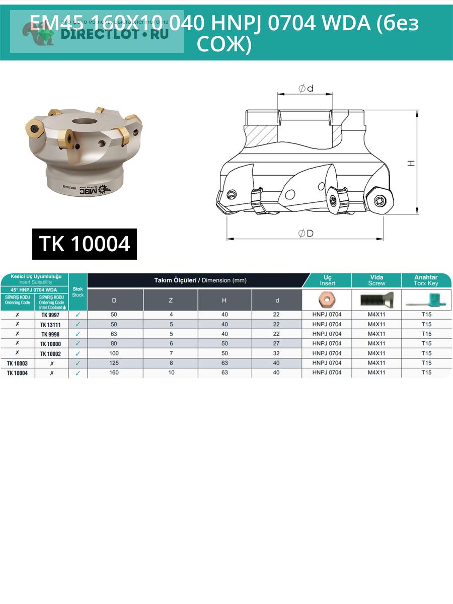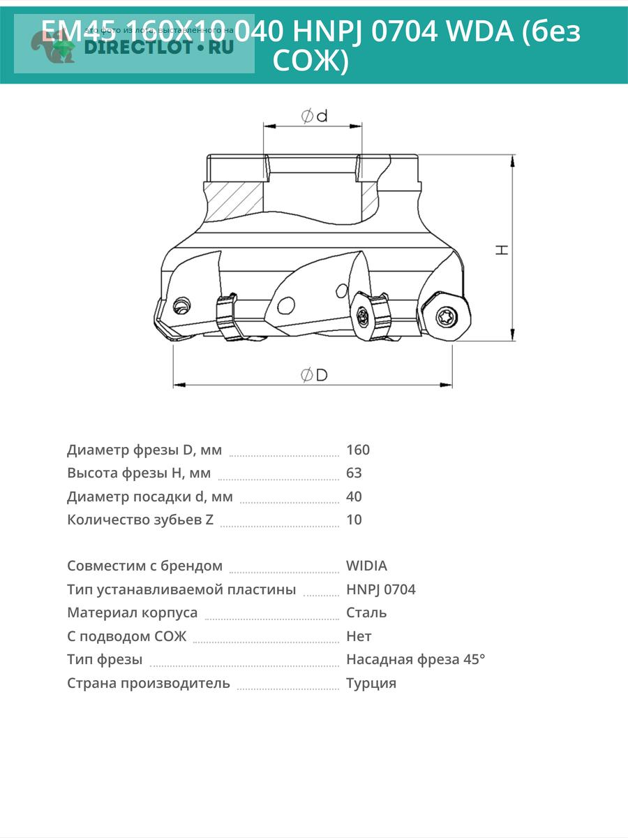 Профессиональная торцевая насадная фреза (совместима с WIDIA), EM45 160X10 040 HNPJ 0704 WDA без отверстия под СОЖ для фрезерного станка, используется с пластинами типа: HNPJ 0704. Угол в плане 45°. Диаметр фрезы 160 мм, диаметр посадки 40 мм, количество зубьев 10 шт.