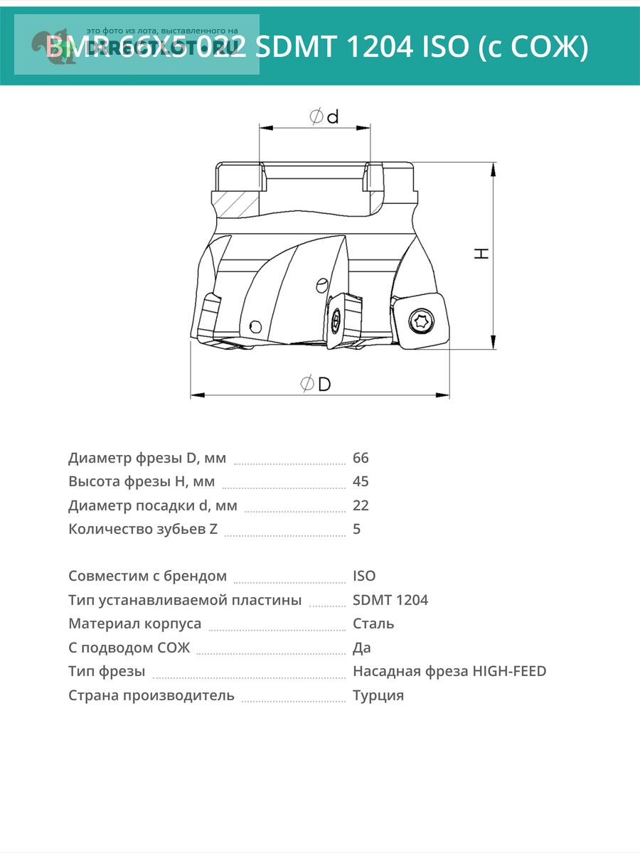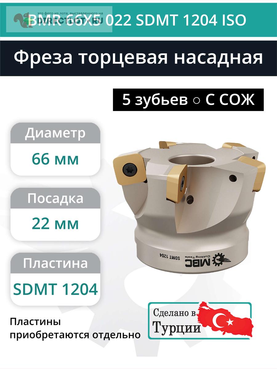 Фреза торцевая насадная 66 мм, посадка 22 мм, 5 зубьев BMR 66X5 022 SDMT 1204 ISO (с СОЖ) купить