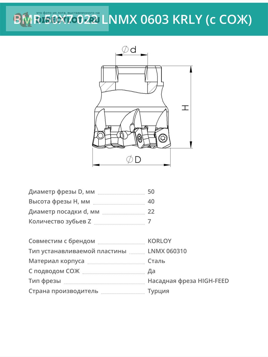 Профессиональная торцевая насадная фреза (совместима с KORLOY), BMR 50X7 022 LNMX 0603 KRLY с отверстием под СОЖ для фрезерного станка, используется с пластинами типа: LNMX 060310. Фреза HIGH-FEED. Диаметр фрезы 50 мм, диаметр посадки 22 мм, количество зубьев 7 шт.