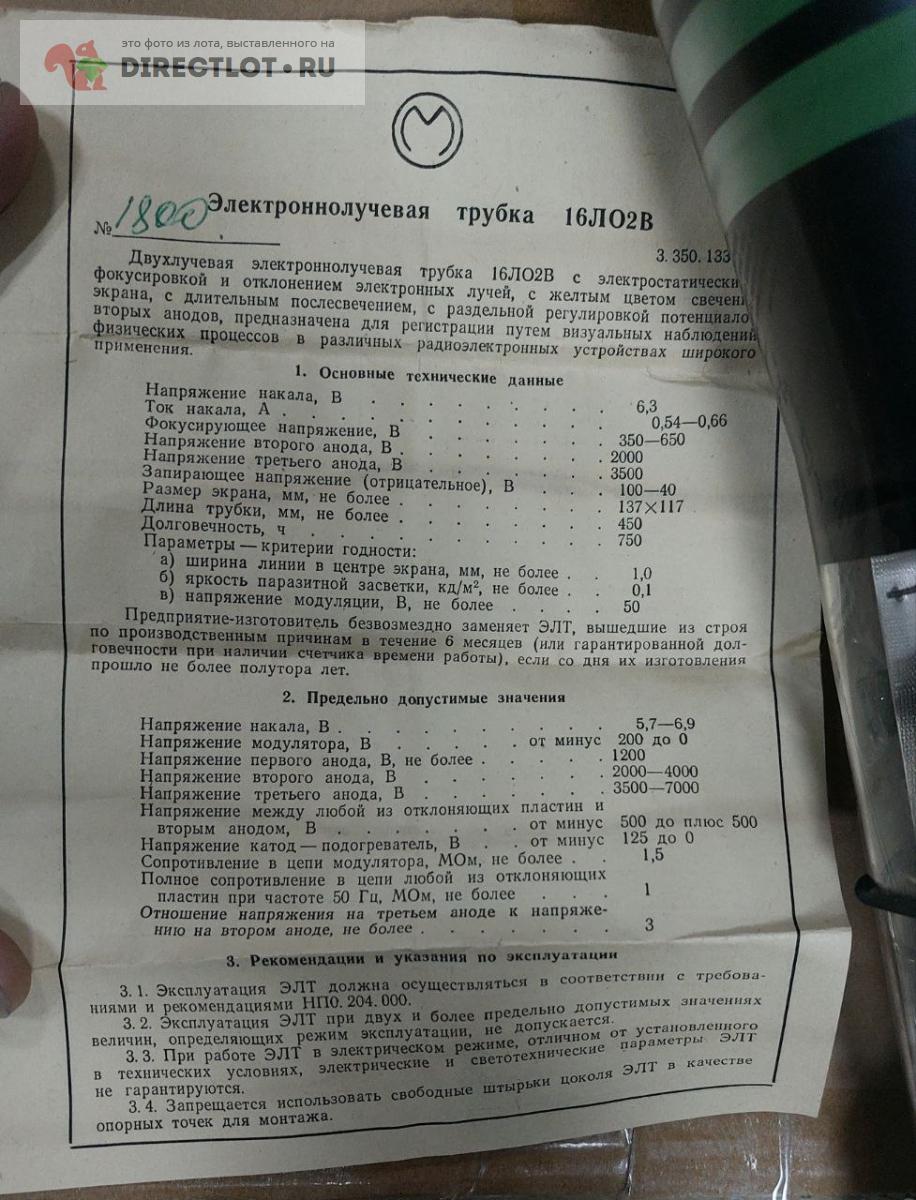Бесплатное объявление 1760137 в рубрике Приборы (осциллографы, генераторы, тестеры, КСВ) продам: Электронно-лучевая трубка 16ЛО2В купить в Москве цена 3000 руб. Объявление размещено пользователем «oberfeldwebel».
