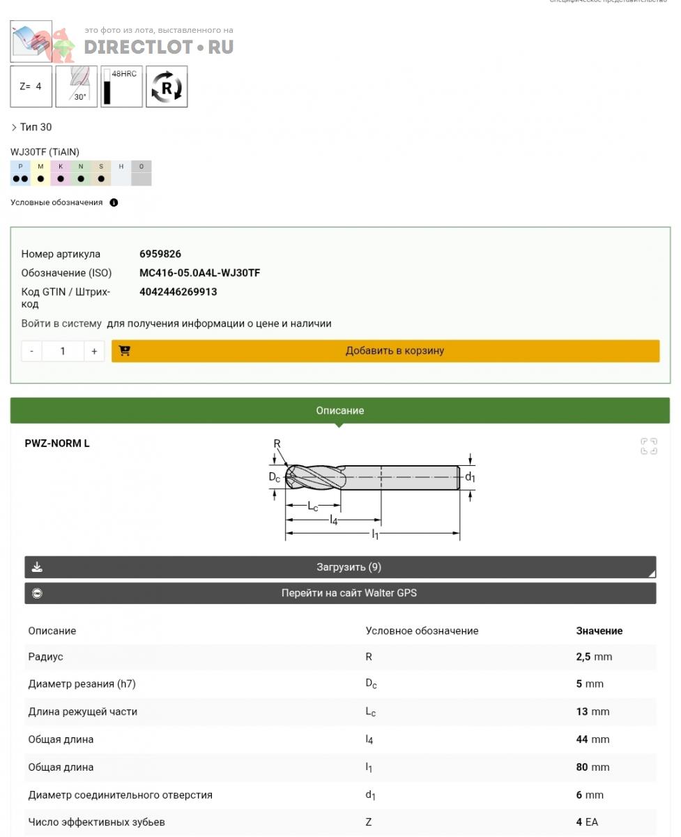 Код для вставки ссылки на эту страницу в сообщения на форумах: [url=https://directlot.ru/lot.php?id=1771454] Фреза сферическая Walter MC416-05.0A4L-WJ30TF купить, объявление на DIRECTLOT.RU [/url]