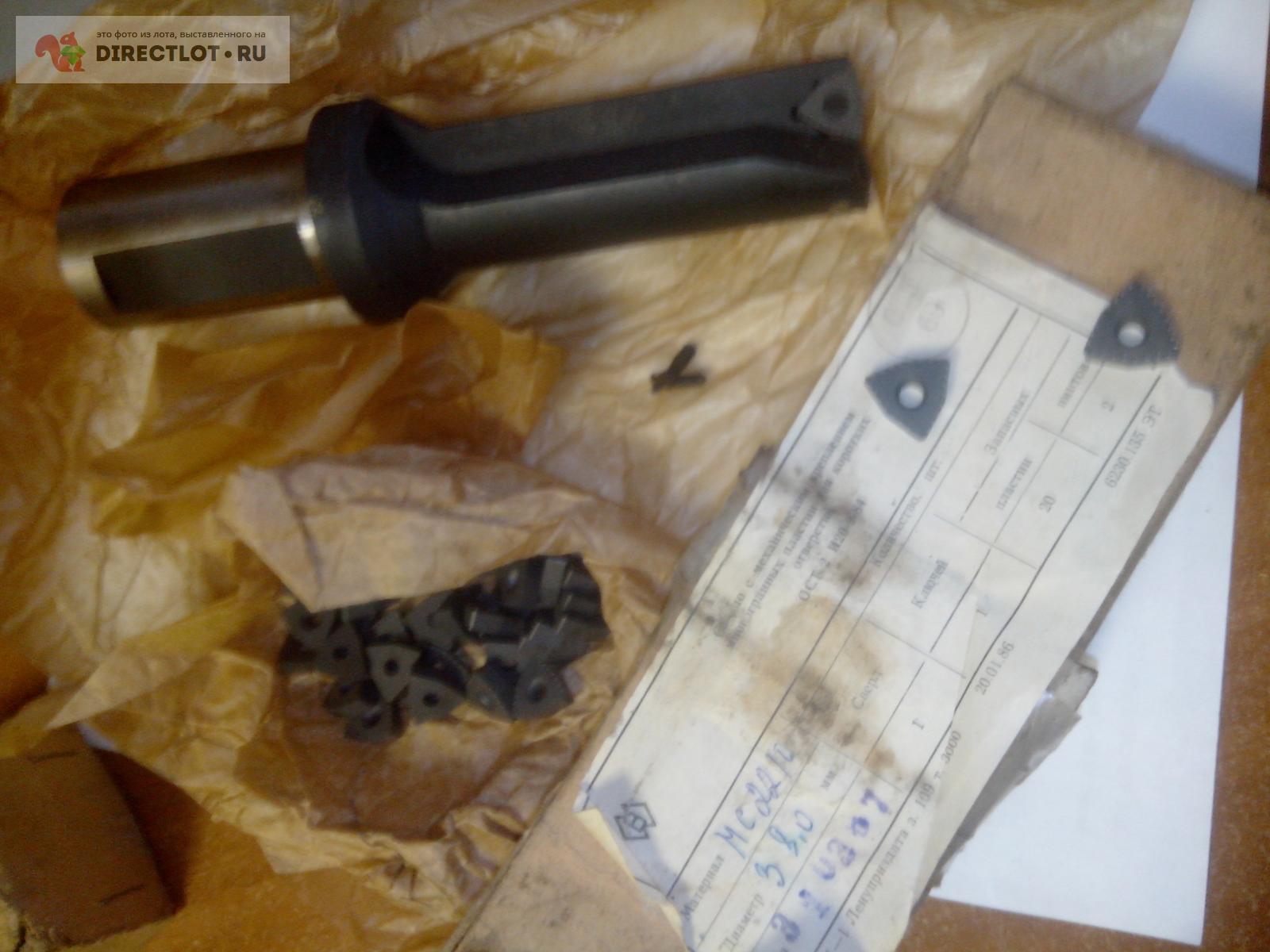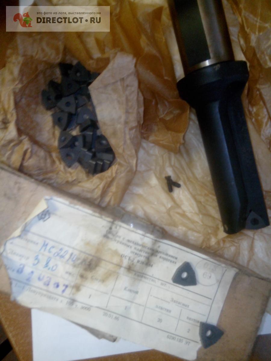 Сверло диаметр 38 мм со сменными твердосплавными пластинами и подводом СОЖ (смазочно охлаждающей жидкости), твердосплавные пластины с обозначением 2008-9156 для коротких отверстий ОСТ 2 И20-9-84, изготовитель сверла диаметром 38 мм со сменными пластинами - Сестрорецкий инструментальный завод - СССР, форма пластины - ломанный треугольник, материал пластин МС 2210, есть пластины сменные в наличии