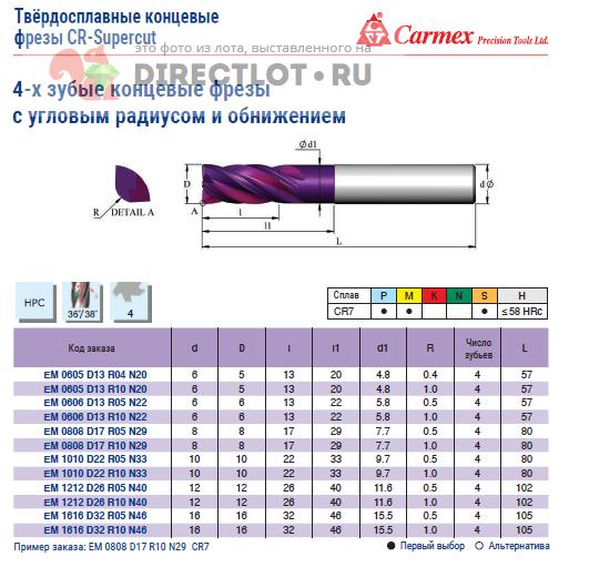 Код для вставки ссылки на эту страницу в сообщения на форумах: [url=https://directlot.ru/lot.php?id=1791667] Фреза твердосплавная ф 12 мм EM 1212 D26 R10 N40 CR7 (ф12мм Z4 R1) Carmex купить, объявление на DIRECTLOT.RU [/url]