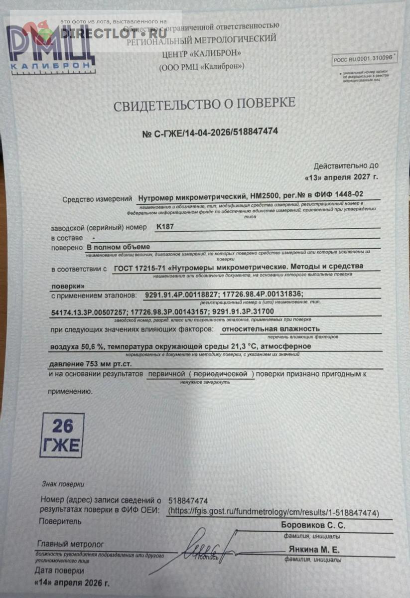 Код для вставки ссылки на эту страницу в сообщения на форумах: [url=https://directlot.ru/lot.php?id=1795290] Нутромер микрометрический НМ 2500. ГОСТ 10-88. Свежая поверка от 14.04.2026 купить, объявление на DIRECTLOT.RU [/url]