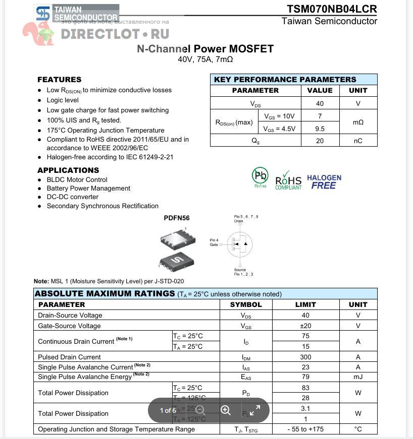 Код для вставки ссылки на эту страницу в сообщения на форумах: [url=https://directlot.ru/lot.php?id=1803721] Транзистор TSM070NB04CR RLG MOSFET N-CH 40V 75A 8-контактный PDFN купить, объявление на DIRECTLOT.RU [/url]