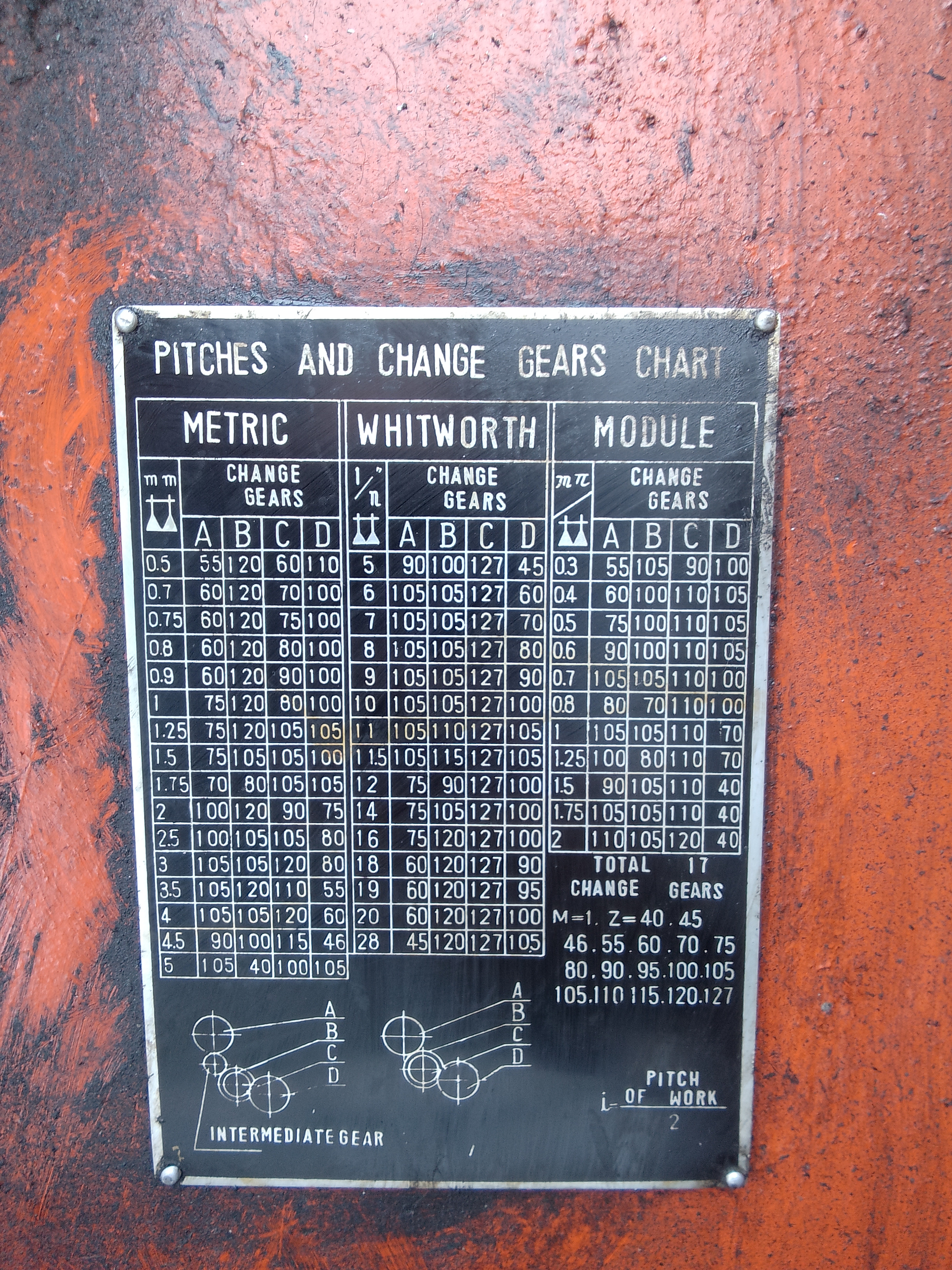 Ну вот. вам нужны метрические шаги, берете выписываете кол-во зубьев для всех шагов, да все и так написано модуль 1. общее количество сменных шестерен 17 шт. Установка согласно схемы, как расчитать диаметр шестерни - Модуль (m) шестерни — это отношение диаметра делительной окружности (D) к количеству зубьев (z). Формула: m = D / z модуль известен кол-во зубьев (Z) тоже