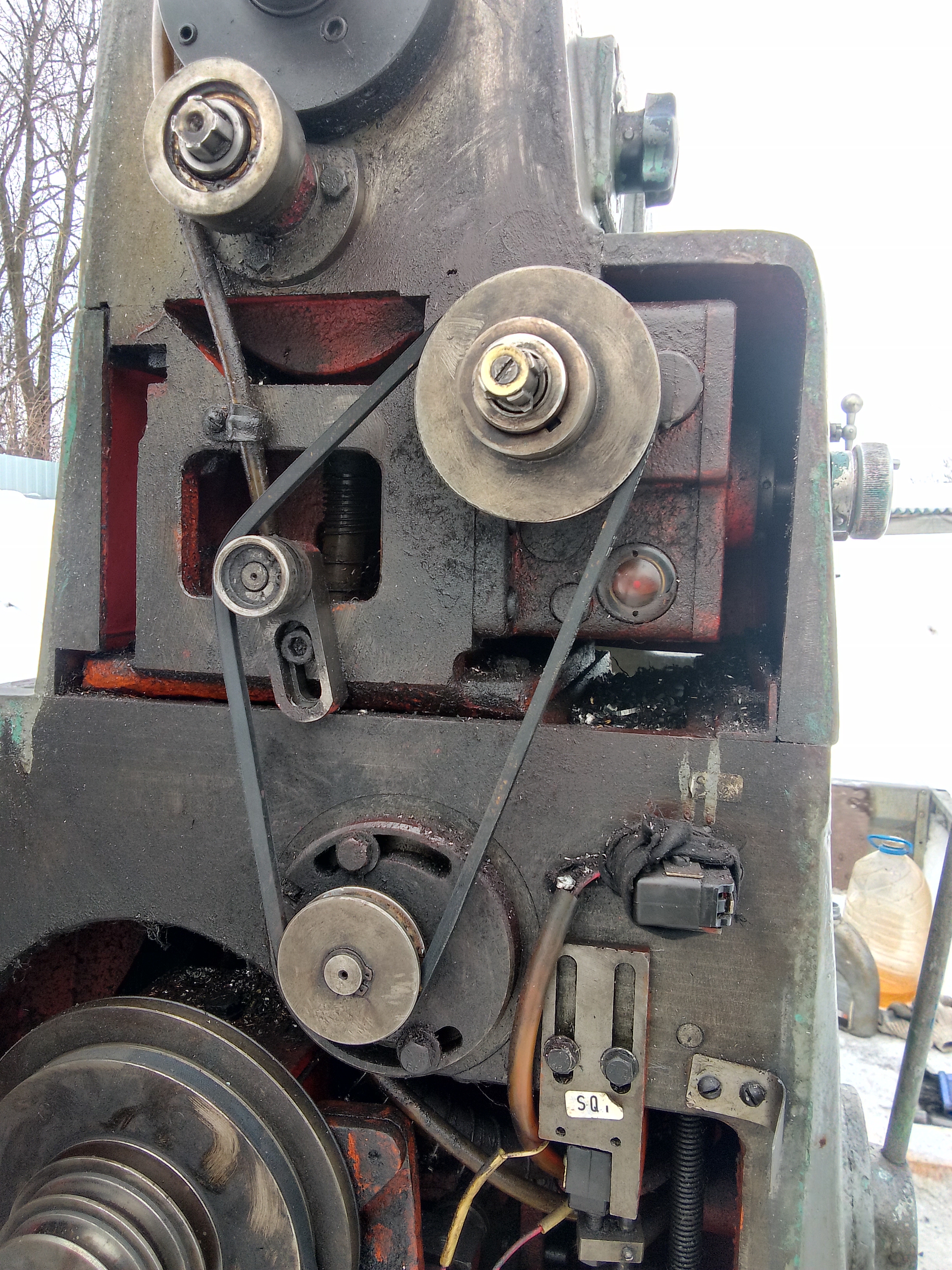 На коробку подач идёт ремень. Ходовой вал вращается.